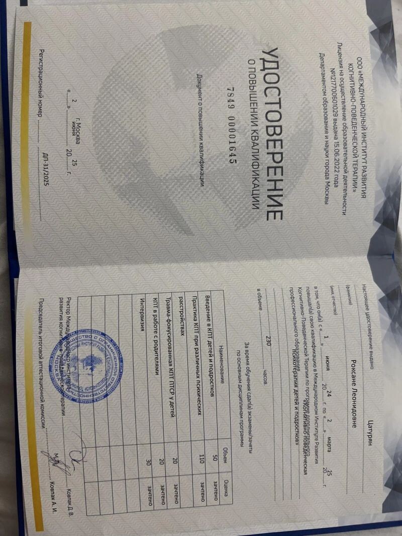 - ООО Международный институт развития когнитивно-поведенческой терапии. Программа дополнительного образования «Когнитивно-поведенческая психотерапия детей и подростков», 2024–2025 гг.