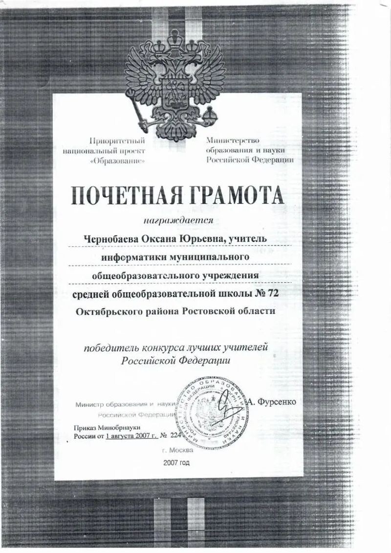 - Почетная грамота министерства образования и науки РФ, победитель ПНП «Образование», 2007 г.