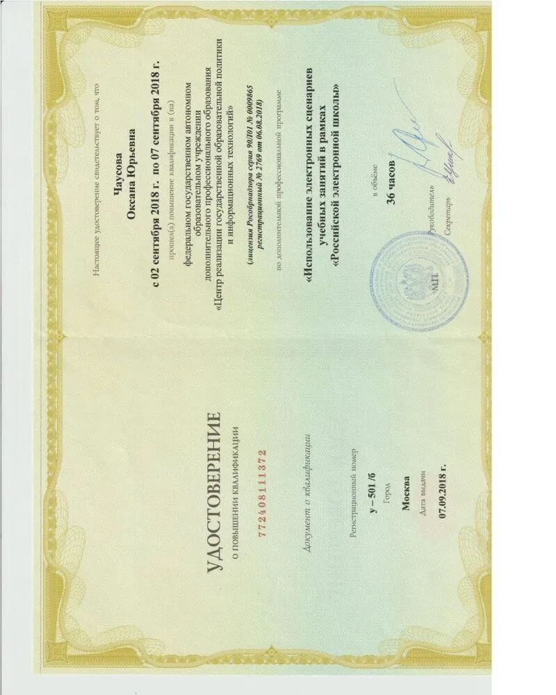 - Центр реализации государственной политики и информационных технологий, программа «Использование электронных сценариев учебных занятий в рамках «Российской электронной школы», 2018 г.