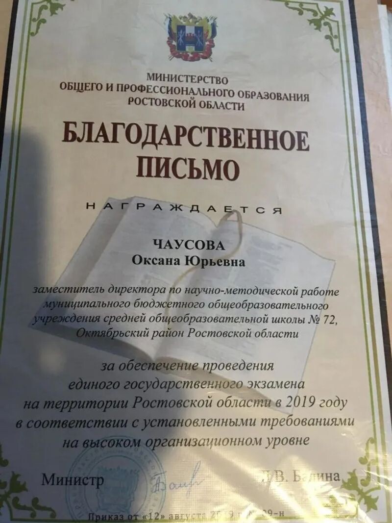 - Благодарственное письмо за обеспечение проведения ЕГЭ на территории Ростовской области, 2020 г.