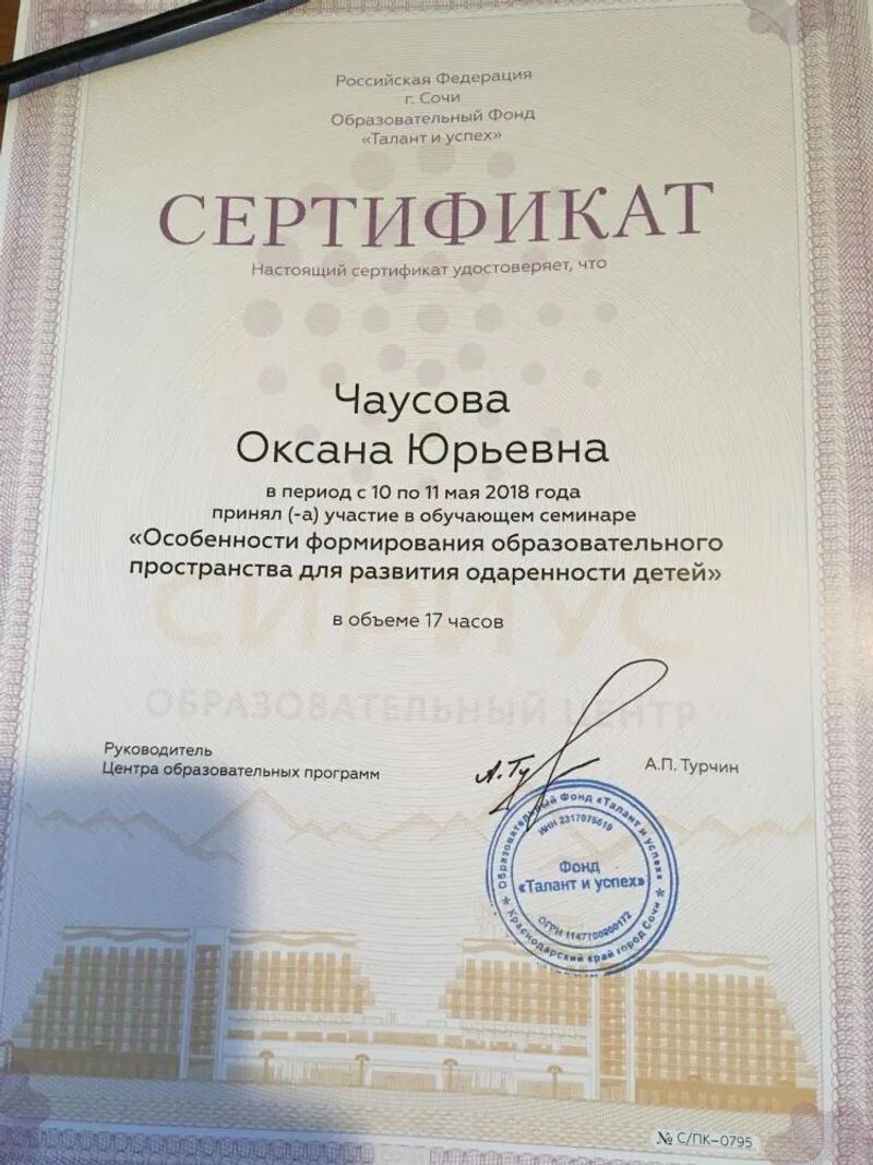- Образовательный фонд «Талант и успех», семинар «Особенности формирования образовательного пространства для развития одарённости детей», 2018 г.