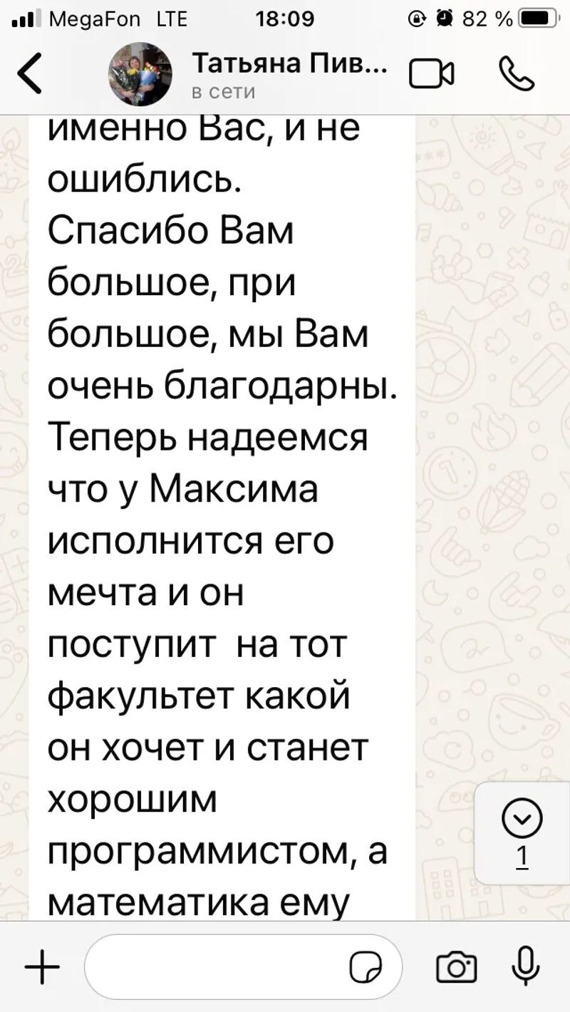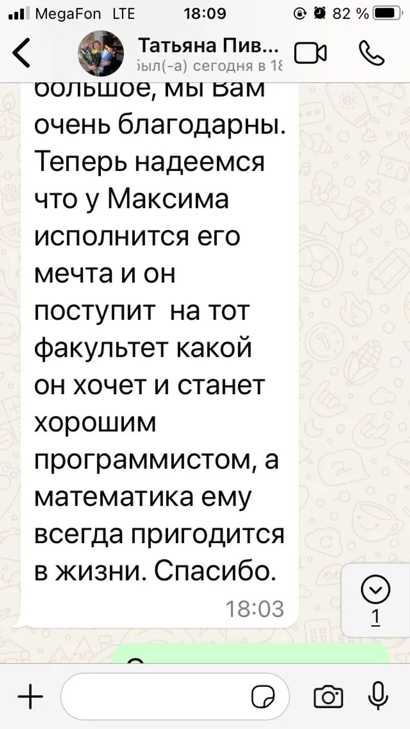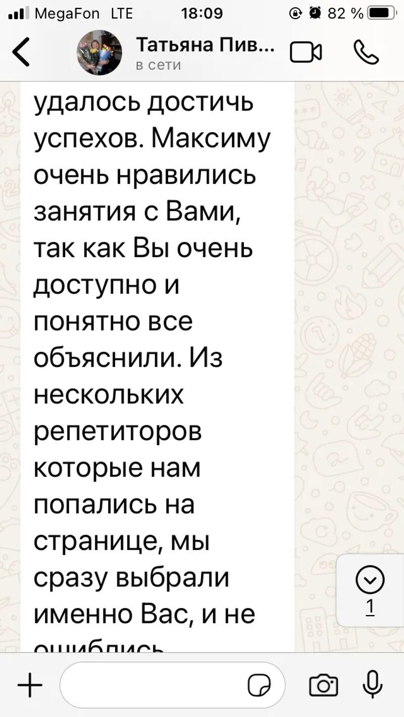 Отличный репетитор по математике для подготовки к ЕГЭ , хорошо объясняет. В процессе занятия подхваливает ученика, появляется стимул решить задачи к которым страшно подойти. Очень позитивная, лишнего не навязывает.