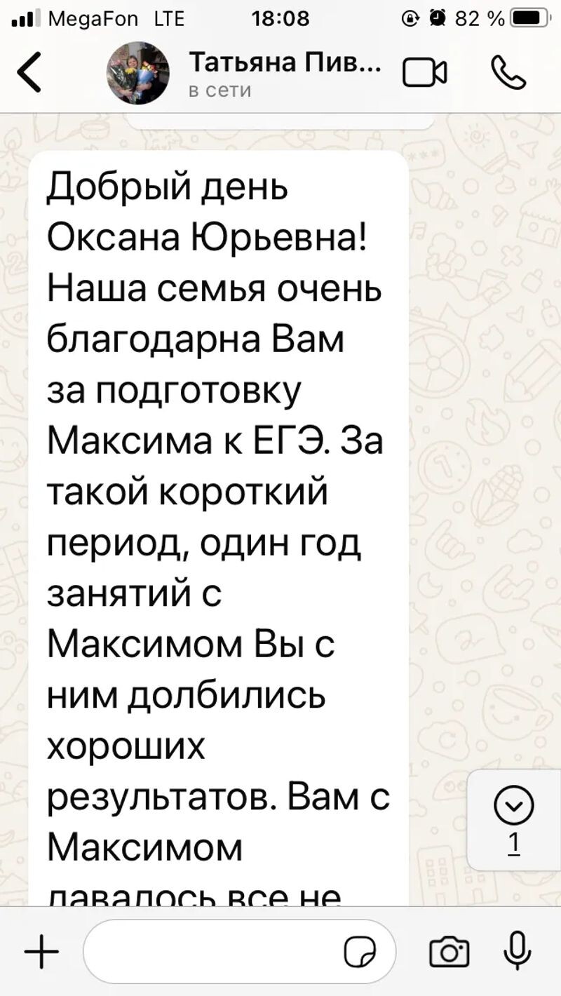 Хочу выразить огромную благодарность Оксане за ее оперативность и профессионализм! Рад, что обратился к такому достойному специалисту. Она отлично объясняет материал, ребенок все понимал. Спасибо за вашу работу и терпение, Оксана! Желаю вам успехов и благодарных учеников.