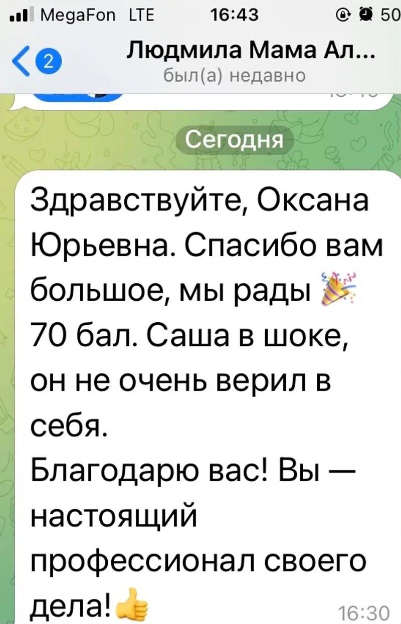Она отличается оперативностью и профессионализмом, что подтверждают благодарные родители учеников. Ее занятия проходят продуктивно и интересно, что позволяет ученикам увлечься учебным процессом. Некоторым студентам удалось значительно улучшить свои результаты на экзаменах, благодаря эффективной помощи Оксаны Юрьевны.