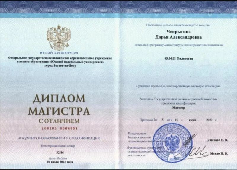 - ЮФУ, магистр по направлению «Филология», 2020–2022 гг.