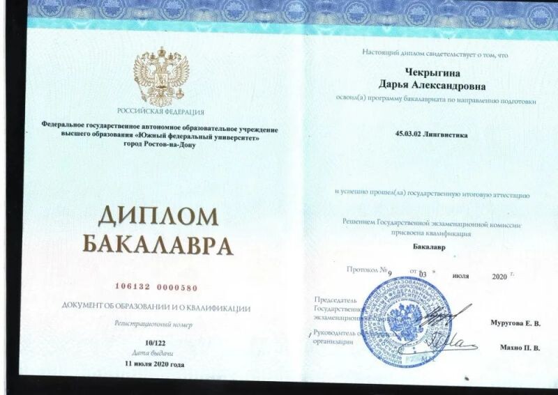 - Южный федеральный университет, направление – лингвистика, бакалавр, 2016–2020 гг.