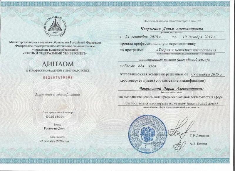 - ЮФУ, профессиональная переподготовка по программе «Теория и методика преподавания иностранных языков (английский язык)», 2018–2019 гг.