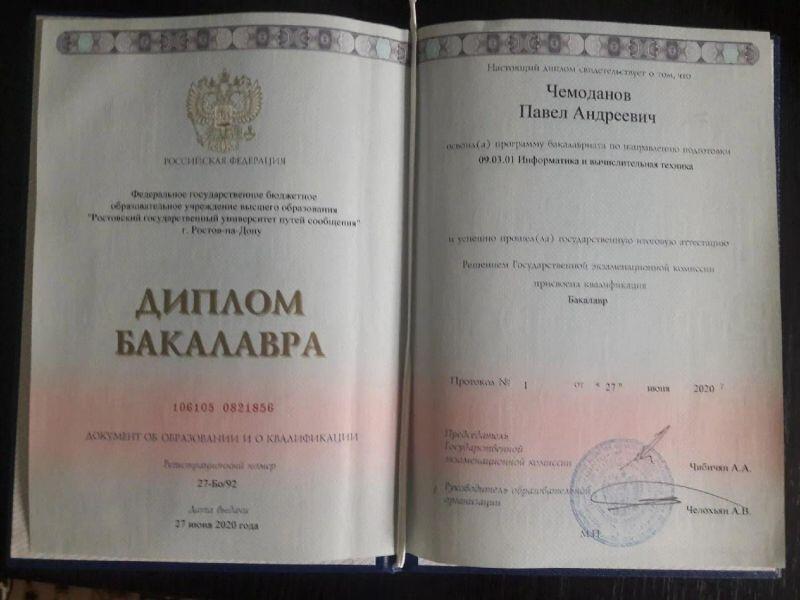 - РГУПС, кафедра информационных технологий и управления, направление — информатика и вычислительная техника, бакалавр, 2016–2020 гг.