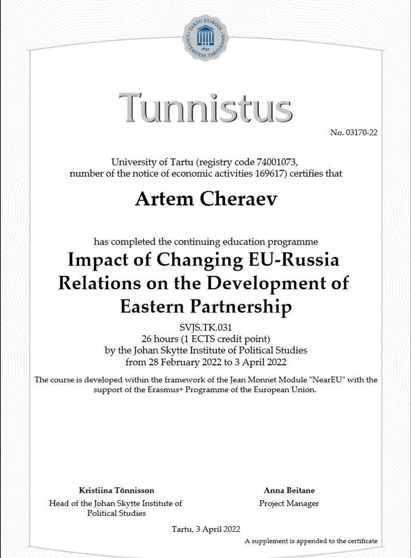 - University of Tartu, Impact of Changing EU-Russia Relations on the Development of Eastern Partnership, 2022 г.