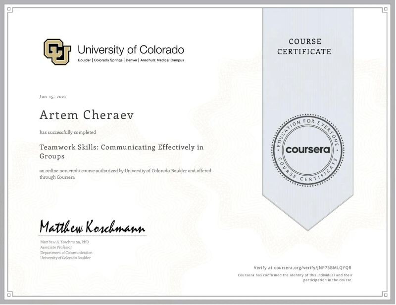- Teamwork Skills: Communicating Effectively in Groups authorized by University of Colorado Boulder, 2020–2021 гг.