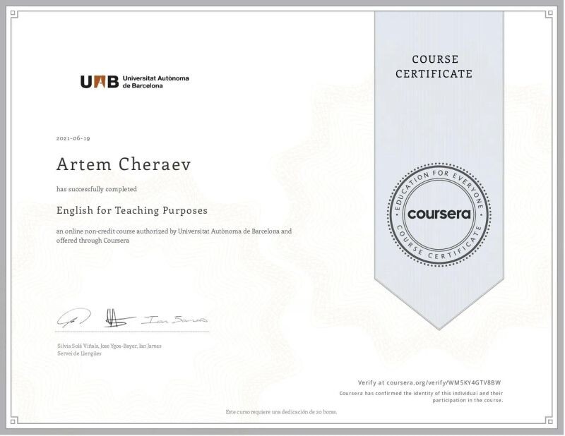 - English for Teaching Purposes authorized by Universitat Autònoma de Barcelona, 2020–2021 гг.