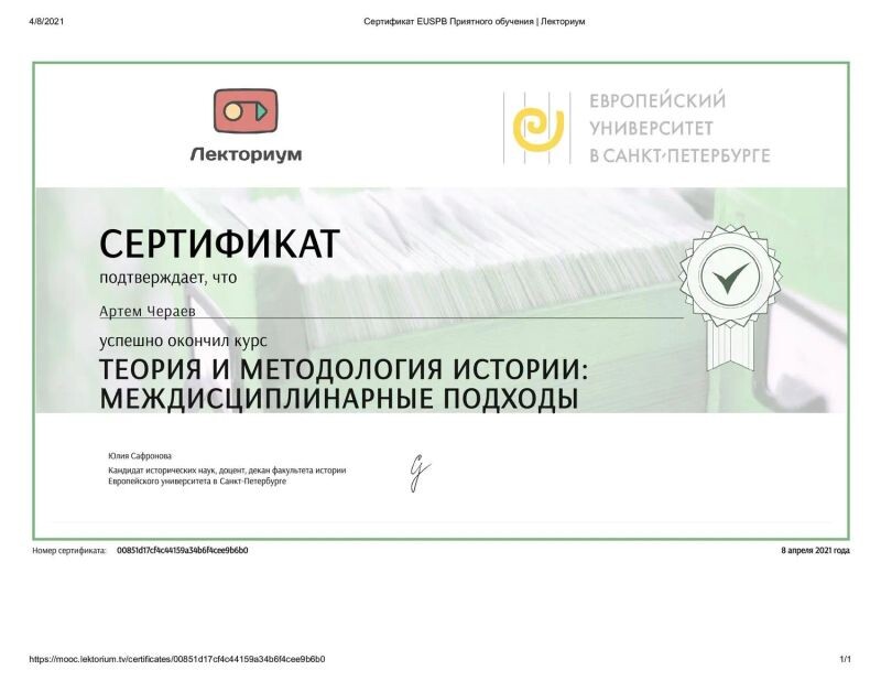 - Европейский университет в Санкт-Петербурге, теория и методология истории: междисциплинарные подходы, 2021 г.