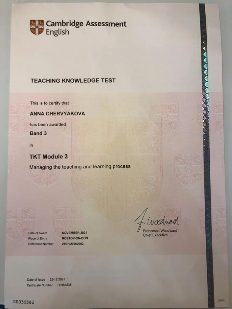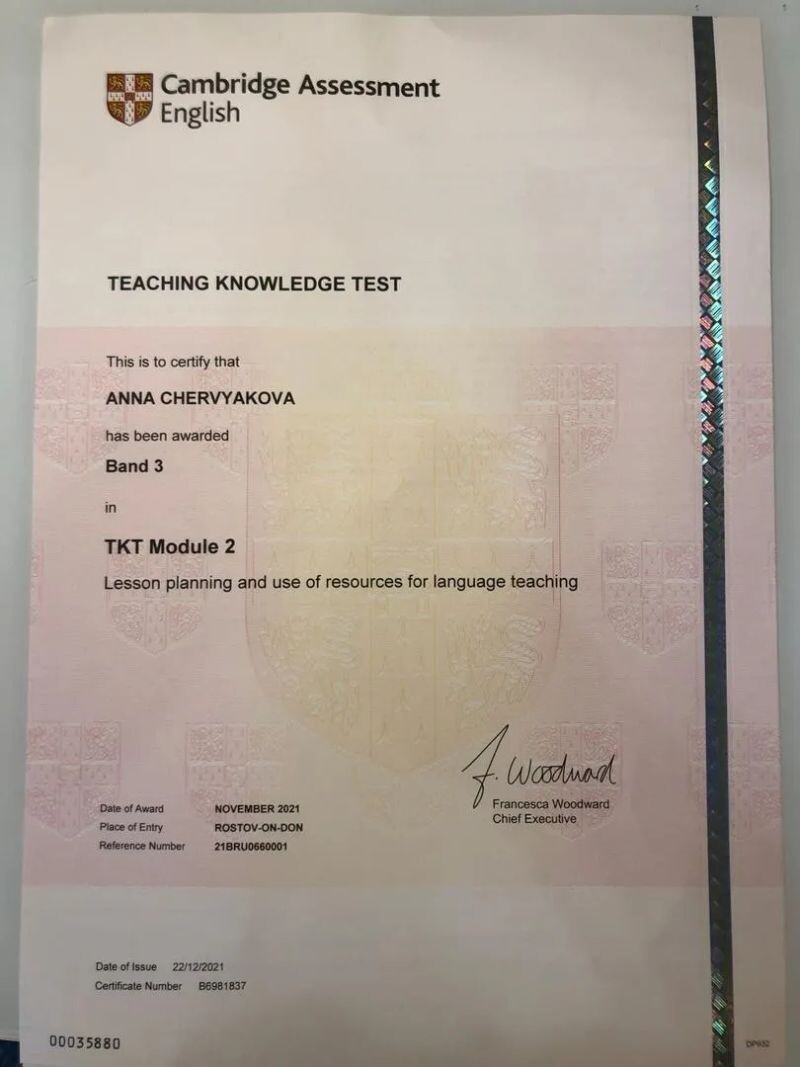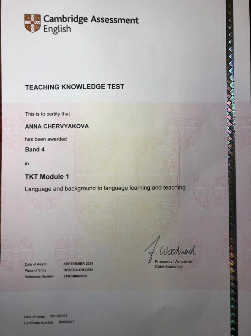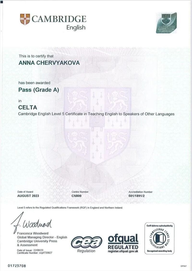 - Аккредитация Cambridge по методике преподавания английского языка CELTA, grade A, 2023 г.