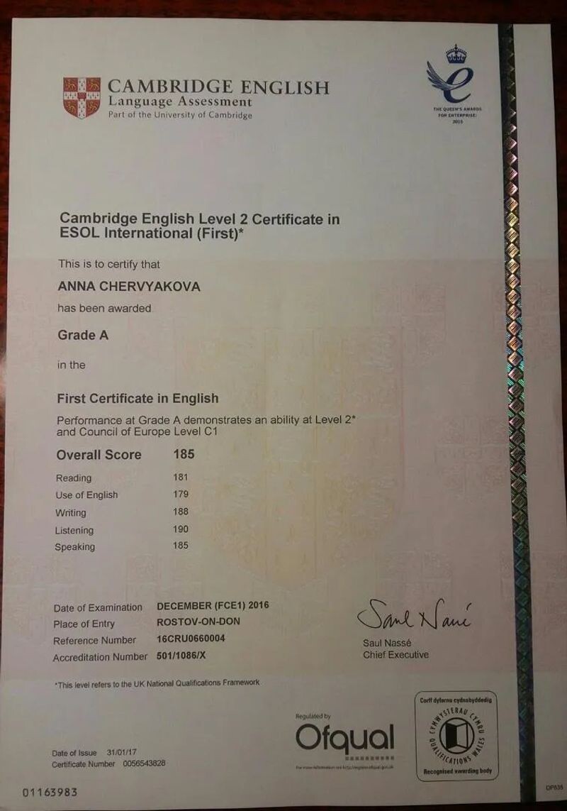 - Сертификат Cambridge English Level 2 Certificate in ESOL International, 2016 г.