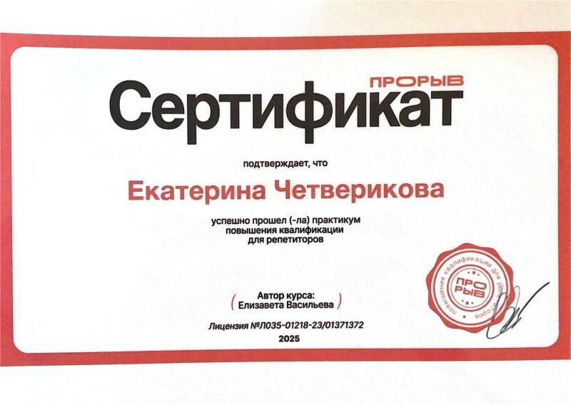 ► Связаться с Четвериковой Екатериной Сергеевной можно за пару минут. Нажмите на кнопку «Связаться с репетитором» и заполните короткую форму.