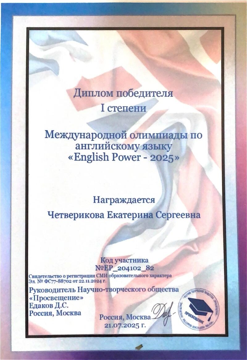 - Победитель I степени Международной олимпиады по английскому языку "English Power - 2025".
