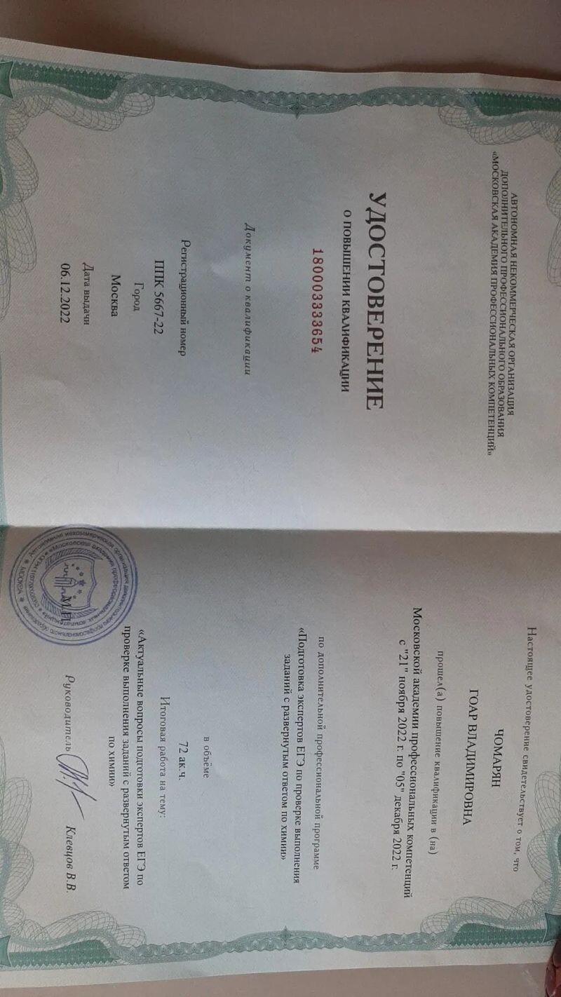 - Московская академия профессиональных компетенций, подготовка экспертов ЕГЭ по проверке выполнения заданий с развернутым ответом по химии, 2022 г.