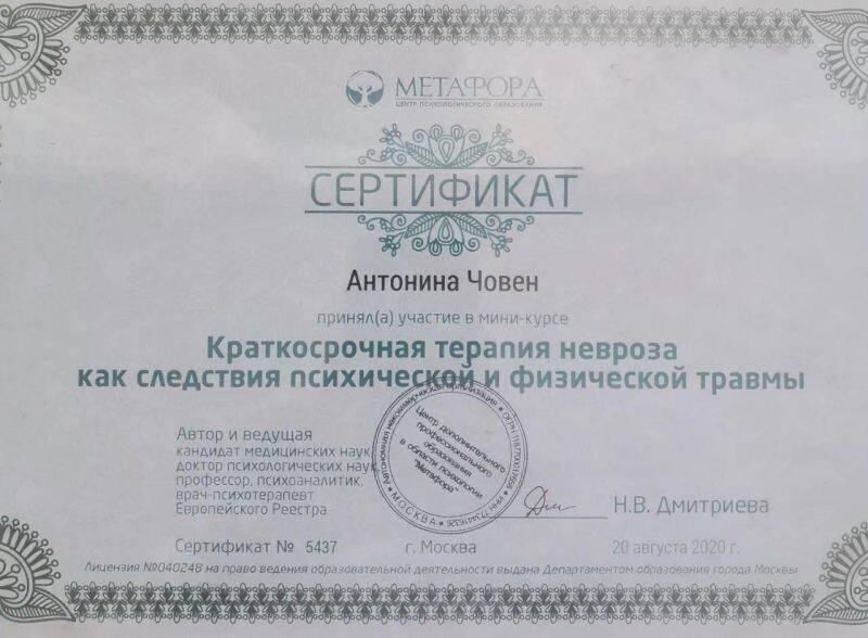 - Учебный центр «Метафора», краткосрочная терапия невроза как следствия психической и физической травмы, 2020 г.