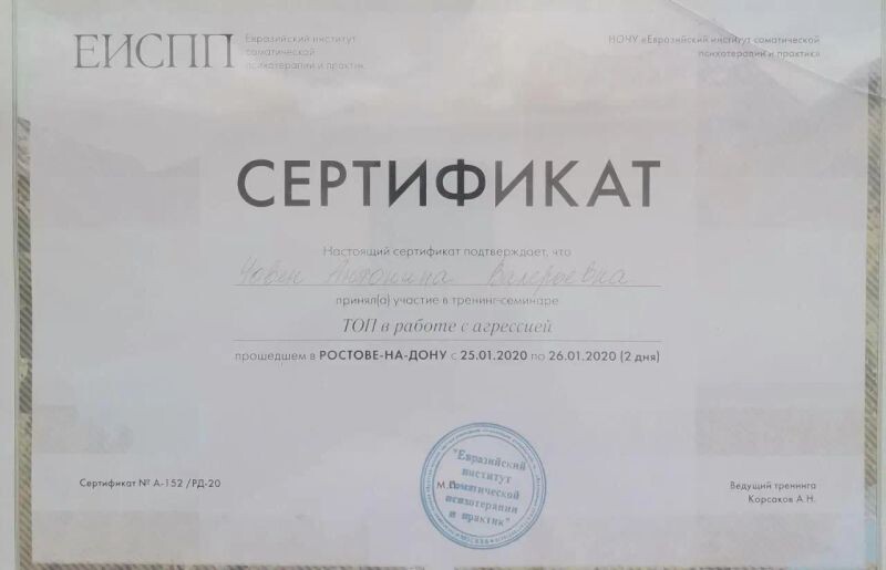 - Евразийский институт соматической психотерапии и практик, курс «Телесно-ориентированная психотерапия в работе с агрессией», 2020 г.