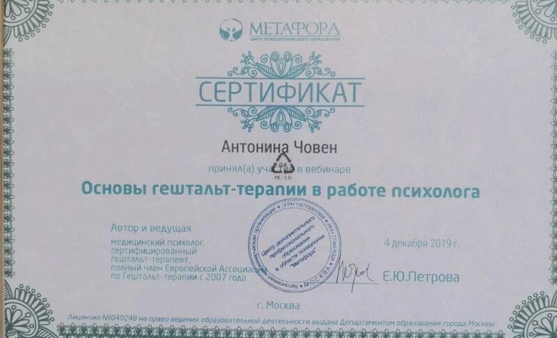 - Учебный центр «Метафора», основы гештальт-терапии в работе психолога, 2019 г.