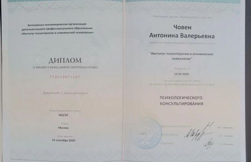- Московский институт психотерапии и клинической психологии, психологическое консультирование, 2018–2020 гг.