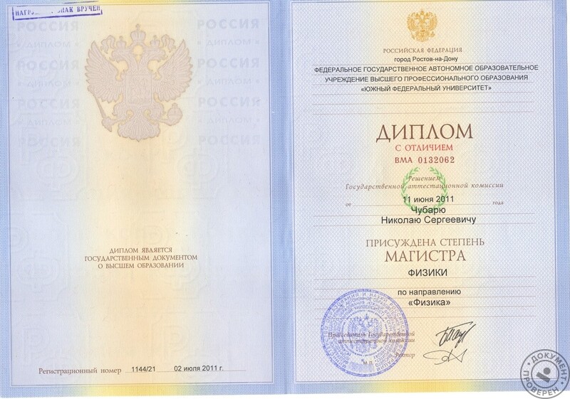 - ЮФУ (РГУ), кафедра теоретической и вычислительной физики, магистр физики (с отличием), 2005–2011 гг.