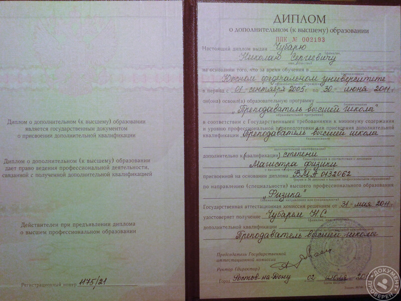 - Дополнительная квалификация – преподаватель высшей школы, ЮФУ, 2009–2011 гг.