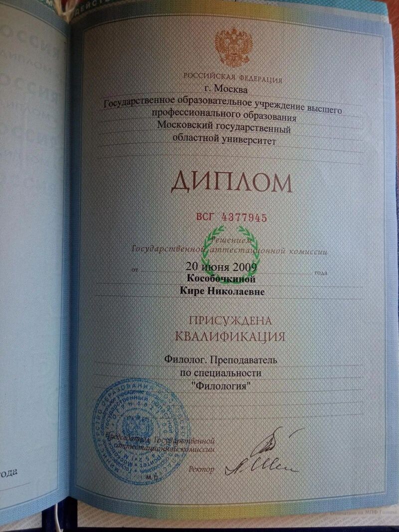 - ГОУ ВПО «Московский государственный областной университет», филолог, преподаватель по специальности «Филология», 2004–2009 гг.