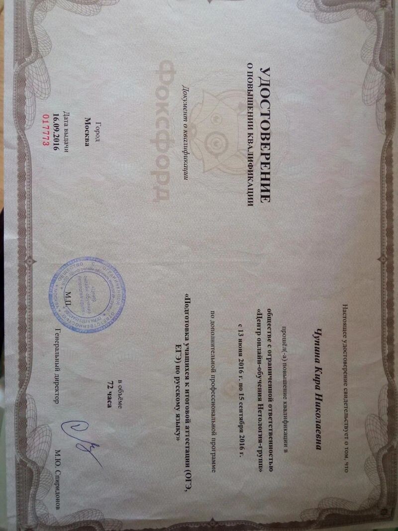 - ООО «Центр онлайн-обучения Нетология-групп», дополнительная профессиональная программа «Подготовка учащихся к итоговой аттестации (ОГЭ, ЕГЭ) по русскому языку», 2016 г.