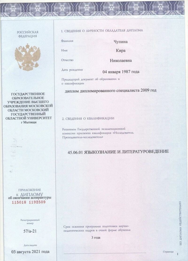 - МГОУ, специализация «Языкознание и литературоведение», квалификация «преподаватель-исследователь», аспирантура, 2019–2021 гг.
