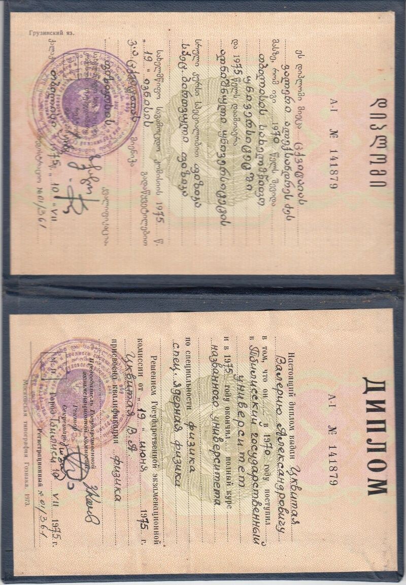 - Тбилисский государственный университет, физический факультет, квалификация – физик, 1970–1975 гг.