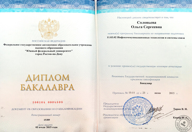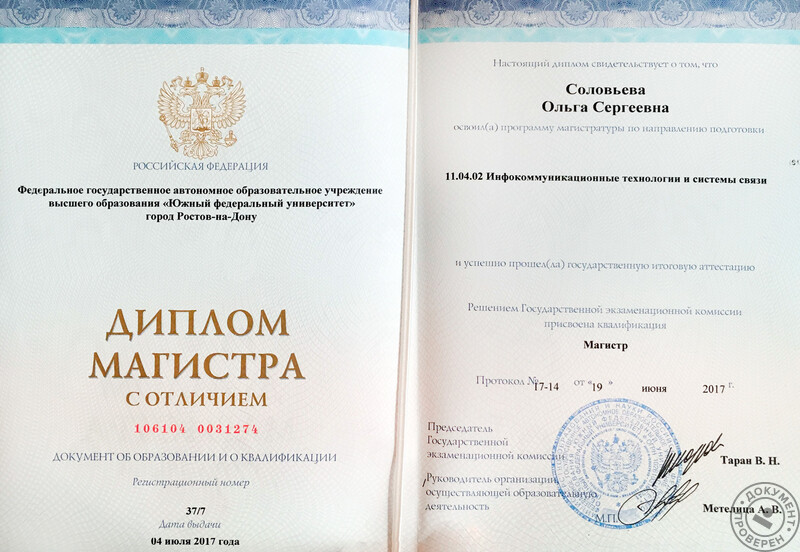 - Окончила Южный федеральный университет, физический факультет, направление – инфокоммуникационные технологии и системы связи, бакалавр (2015 г.); магистр, диплом с отличием (2017 г.).