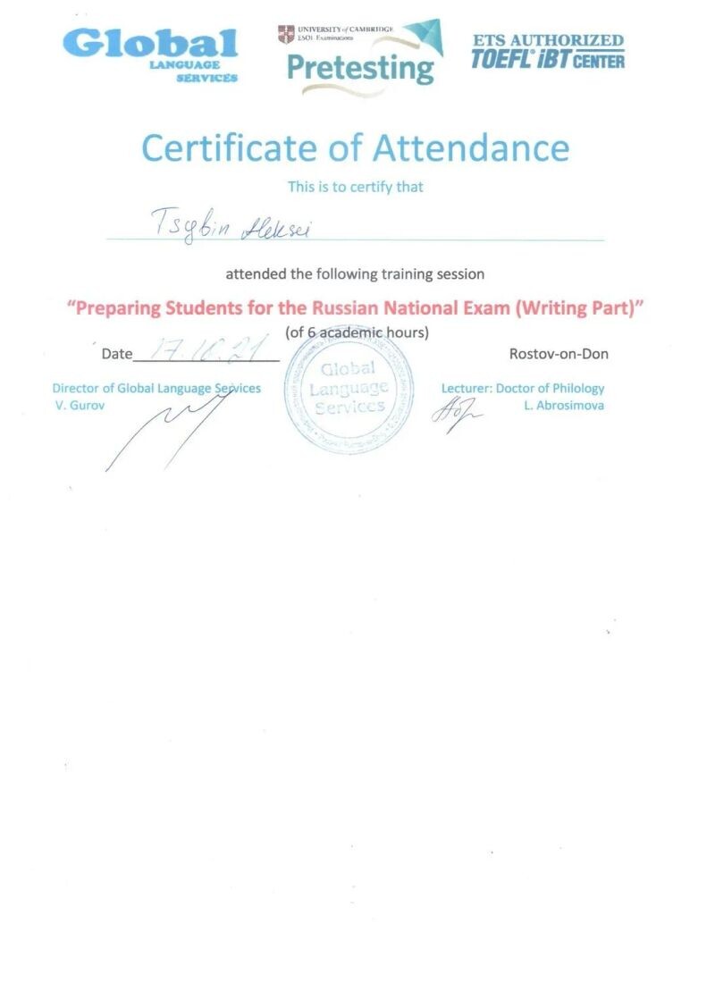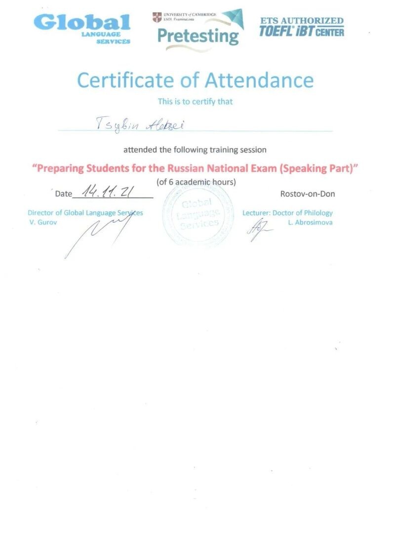 - Сертификат участника семинара «Подготовка студентов к ЕГЭ (устная часть)», 2021 г.