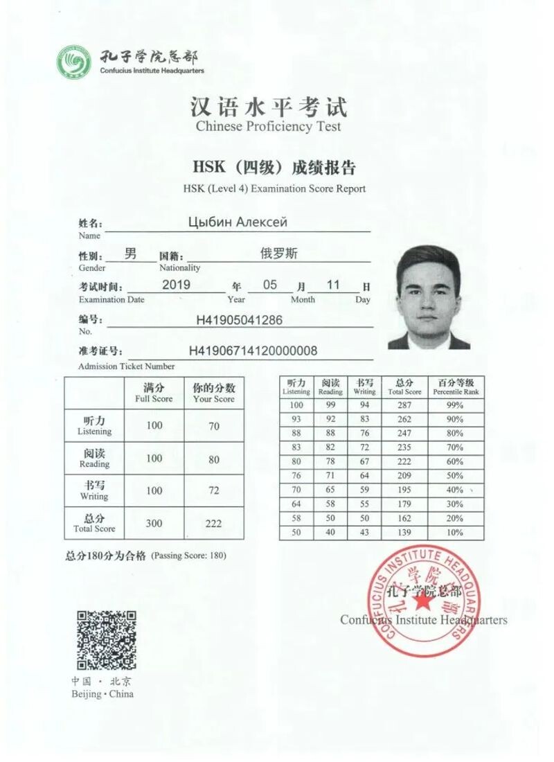 - Экзамен китайского языка HSK4 ( соответствует уровню В2 Общеевропейской компетенции владения иностранным языком (CEFR) (с 2019 г.).