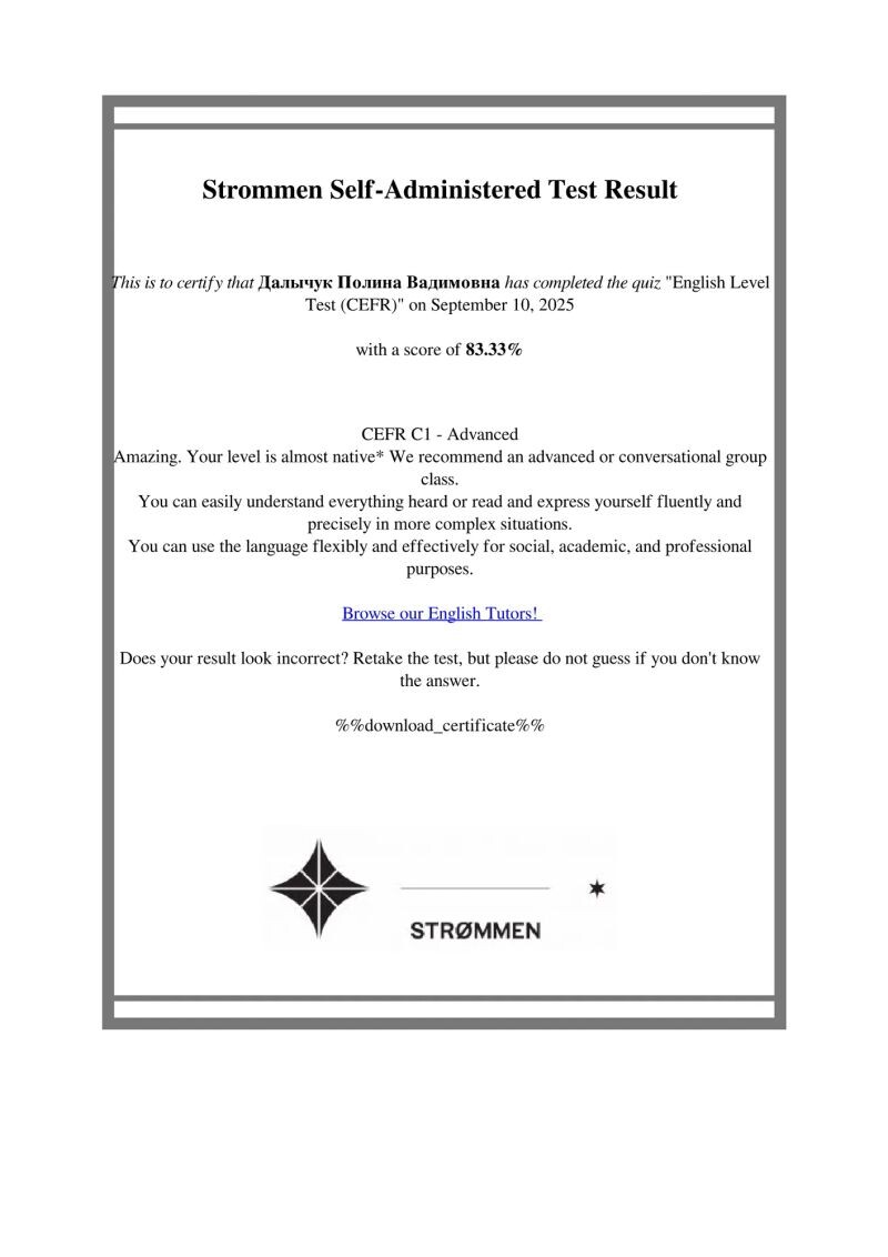 - Сертификат, подтверждающий С1 уровень английского языка, 2025 г.