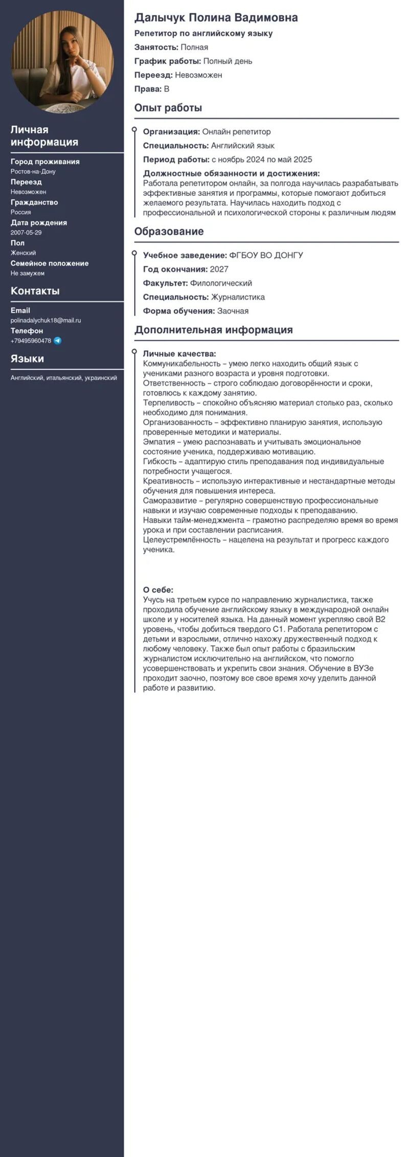 ► Связаться с Далычук Полиной Вадимовной можно за пару минут. Нажмите на кнопку «Связаться с репетитором» и заполните короткую форму.