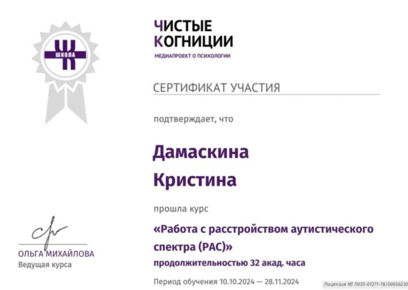 - Чистые когниции "Работа с ратройством аутистического спектра (РАС)", 2024 г.