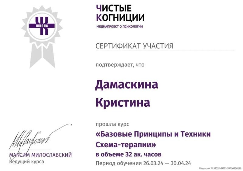 - Психодемия "Схема-терапия" (с 2024 г.).
