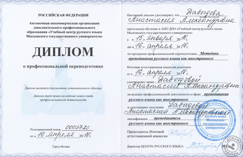 - Учебный центр русского языка МГУ, профессиональная переподготовка по программе «Методика преподавания русского языка как иностранного» (2018 г.).