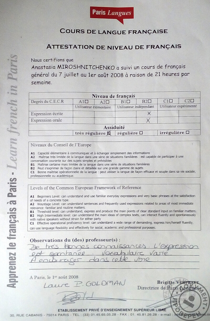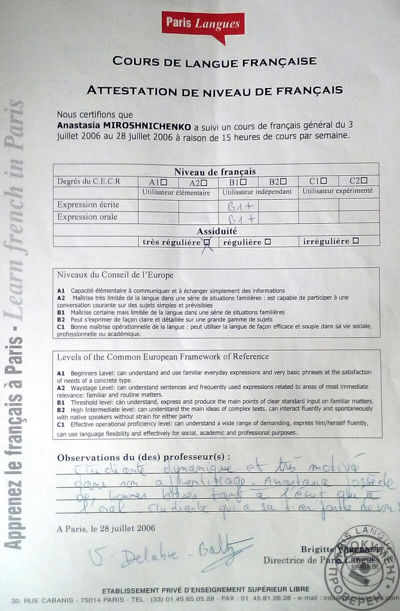 - DELF В2 (2008 г.), DELF В1 (2006 г.).