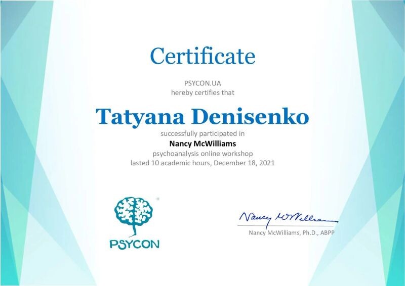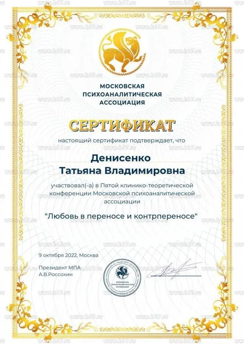 - Московская психоаналитическая ассоциация Сертификат участника Пятая клинико-теоретическая Конференции "Любовь в переносе и контрпереносе". Объем часов: 7, 2022 год.