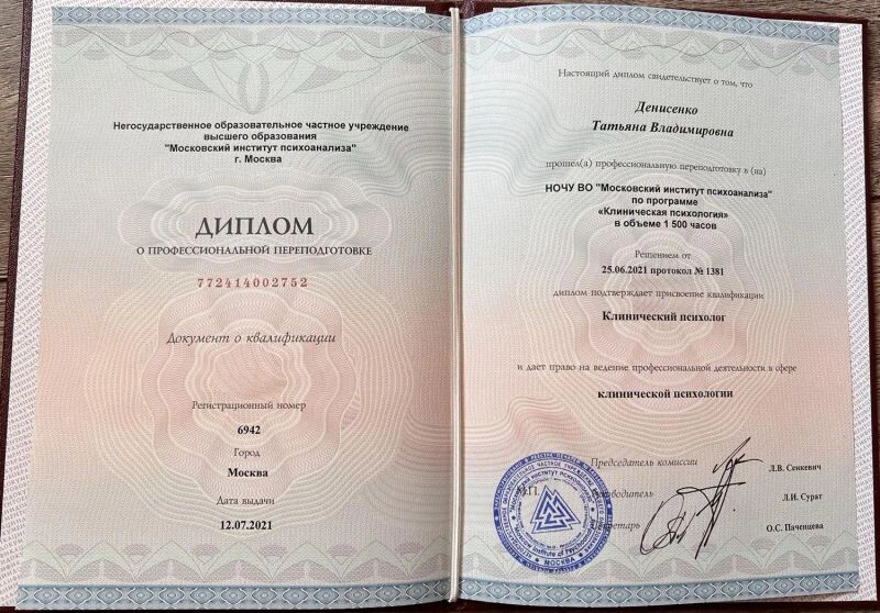 - Московский институт психоанализа, клинический психолог, 2020–2021 гг.