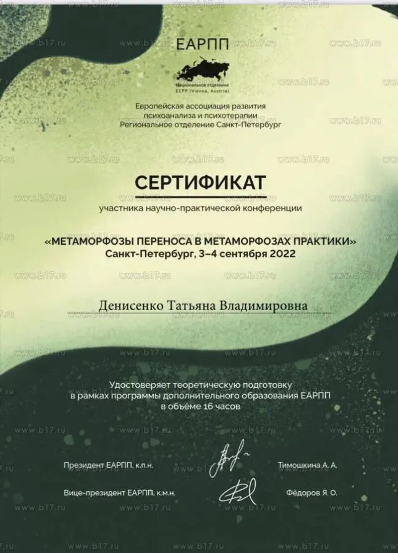 - Европейская ассоциация развития психоанализа и психотерапии Региональное отделение Санкт-Петербург СЕРТИФИКАТ участника научно-практической конференции «МЕТАМОРФОЗЫ ПЕРЕНОСА В МЕТАМОРФОЗАХ ПРАКТИКИ» Санкт-Петербург, 3–4 сентября 2022, 16 часов.