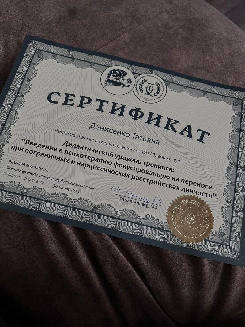 - Тренинг Отто Кернберга «Введение в психотерапию фокусированную на переносе при пограничных и нарциссических расстройствах личности», 2023 г.