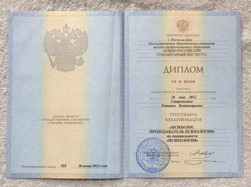 - Южно-российский гуманитарный институт, Психолог, преподаватель психологии, 2007–2012 гг.