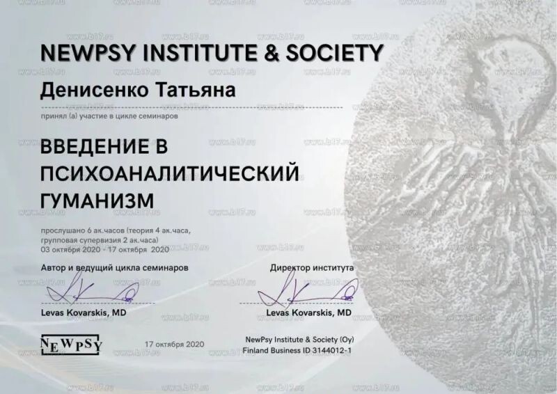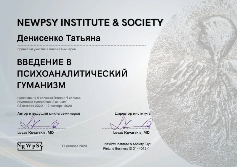 - NEWPSY INSTITUTE&SOCIETY Levas Kovarskis, введение в психоаналитический гуманизм, cертификат участника цикла семинаров, 2020 г.
