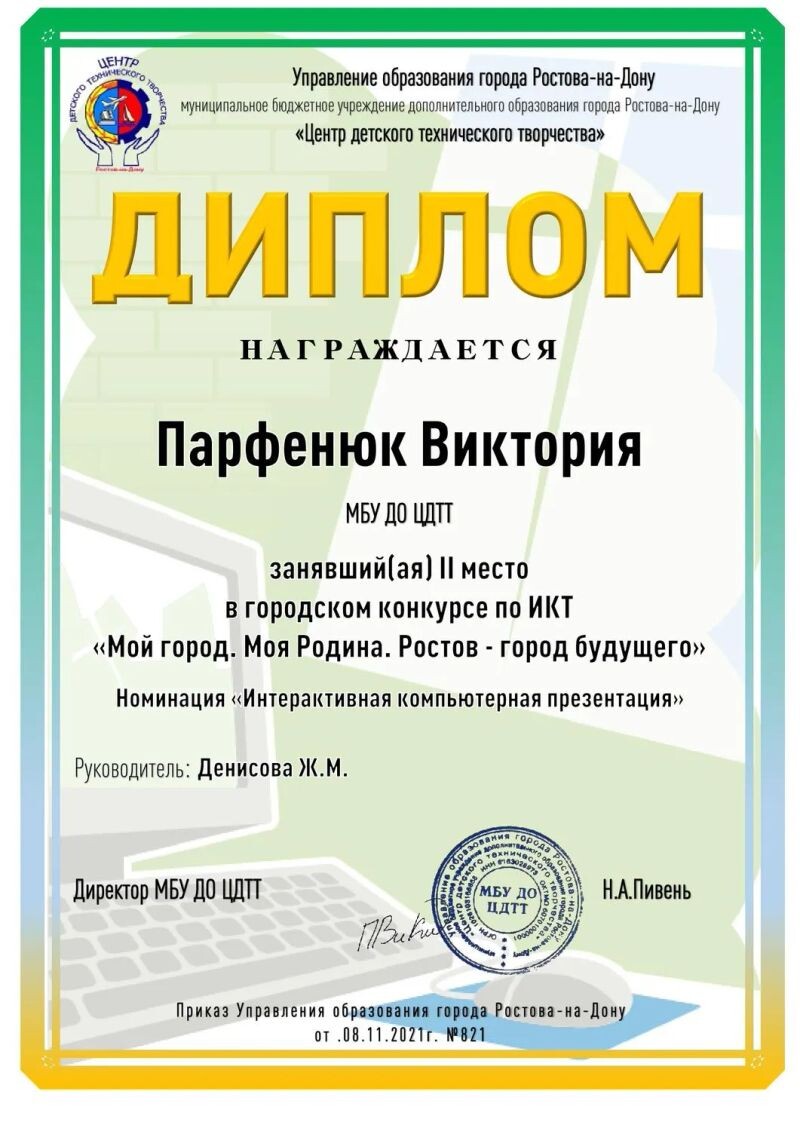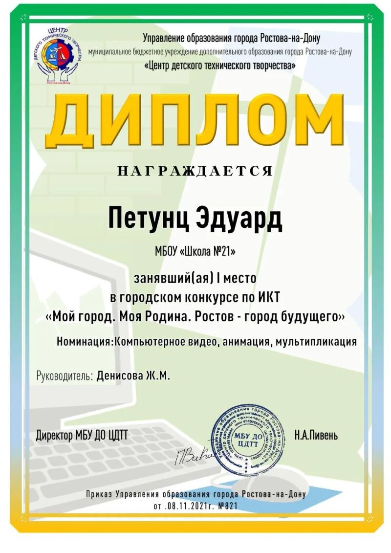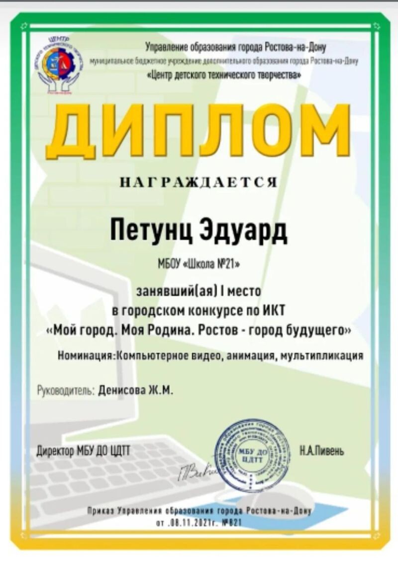 - Диплом ученика за 1 место в городском конкурсе по ИКТ, 2021 г.