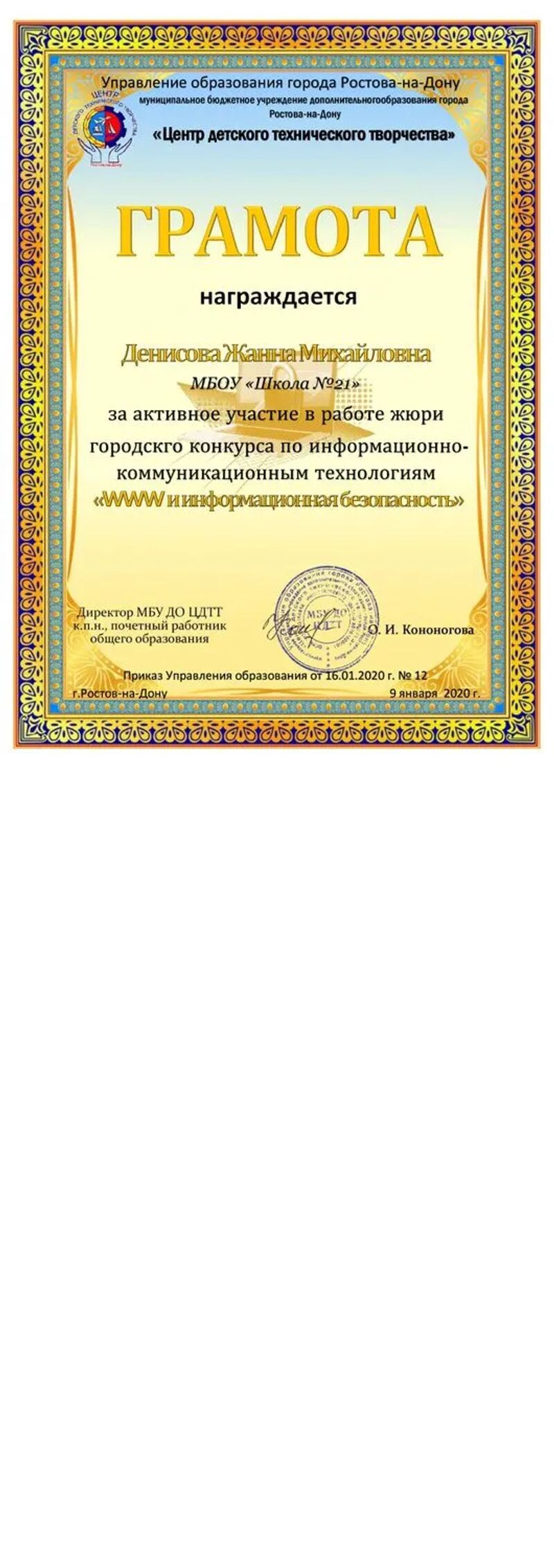 - Грамота за активную работу жюри городского конкурса ИКТ, 2019 г.