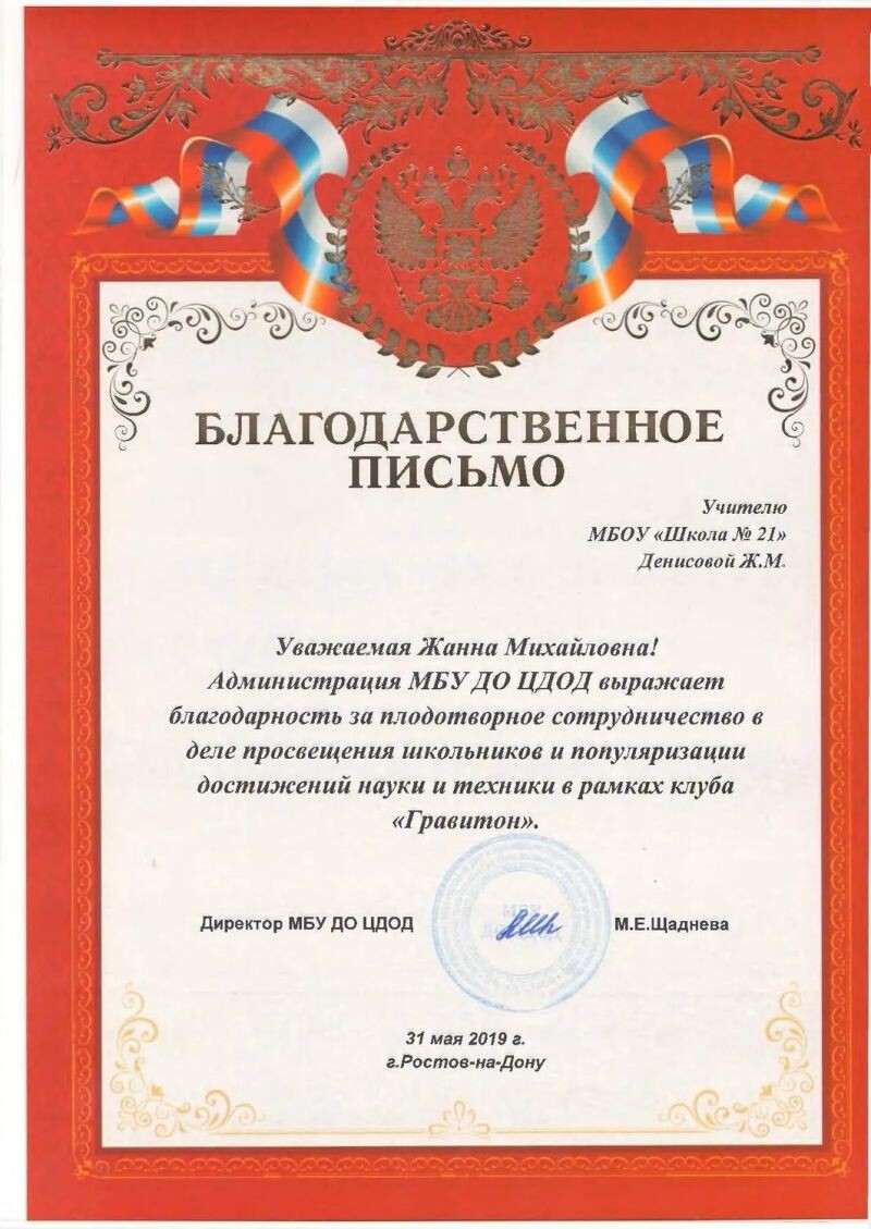 - Благодарность ИКТ клуба «Гравитон», 2019 г.