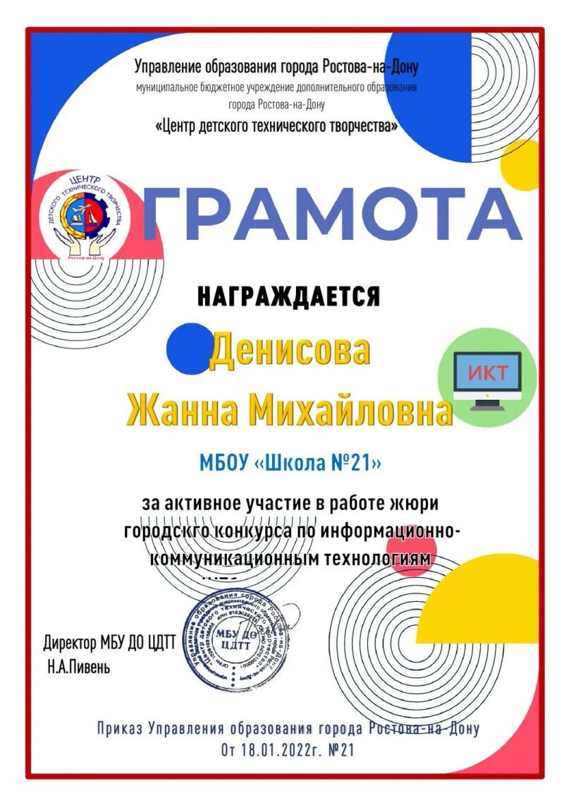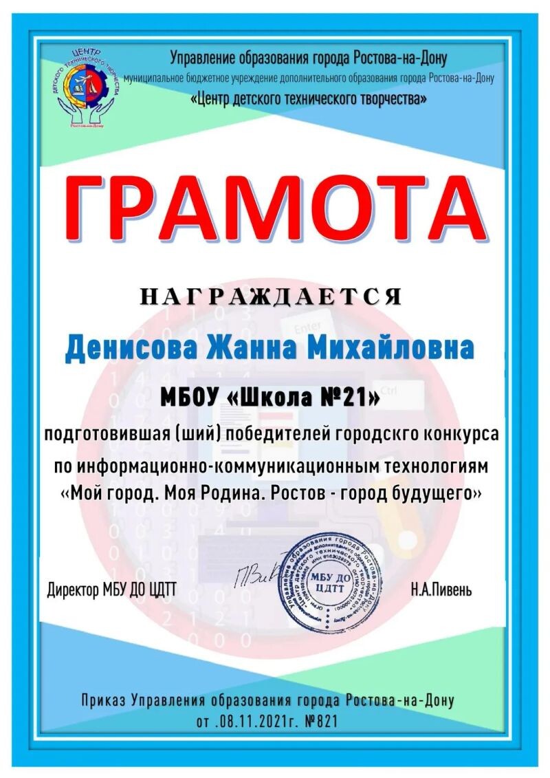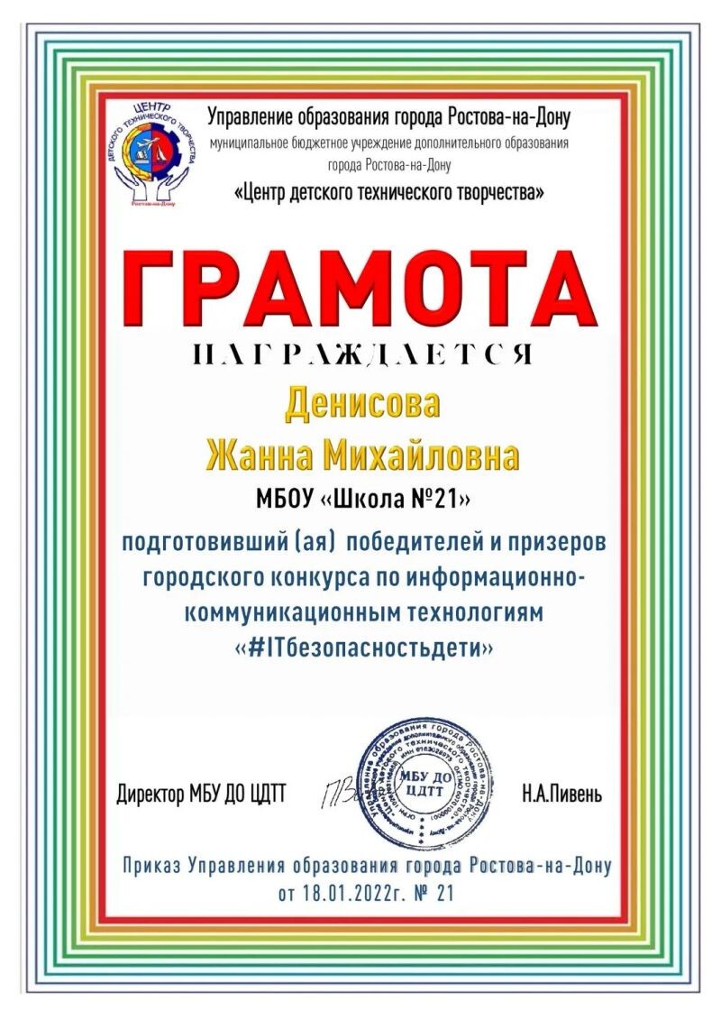 - Грамота за подготовку победителей городского конкурса по ИКТ, 2021 г.
